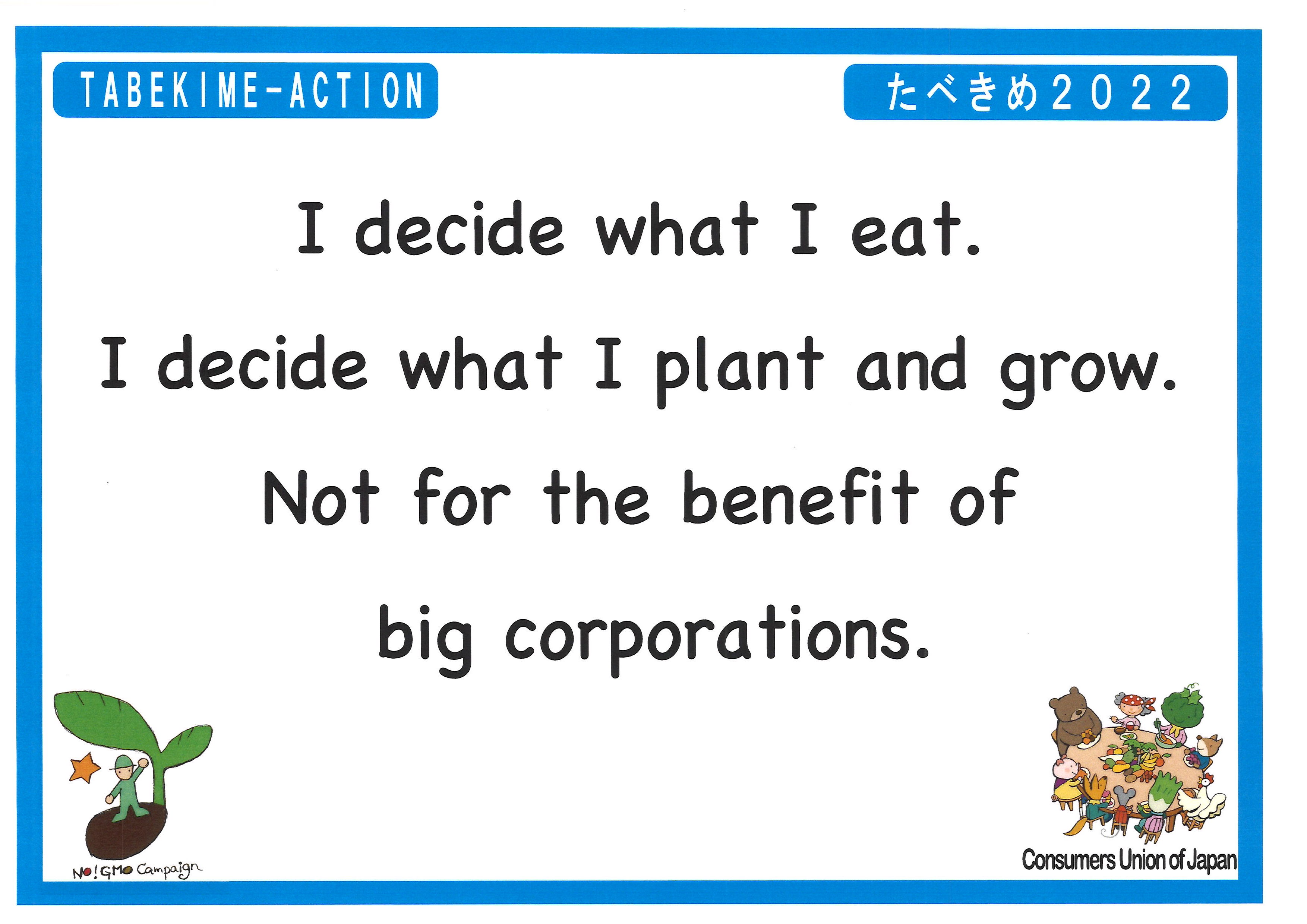 We, together with family farmers, small farmers’ groups and citizens’ groups around the world, have been opposing the domination of food by multinational corporations. We will promote the TABEKIME Campaign, an abbreviation for “We decide what we eat ourselves,” which was very popular last year, starting from World Food Day this year.
