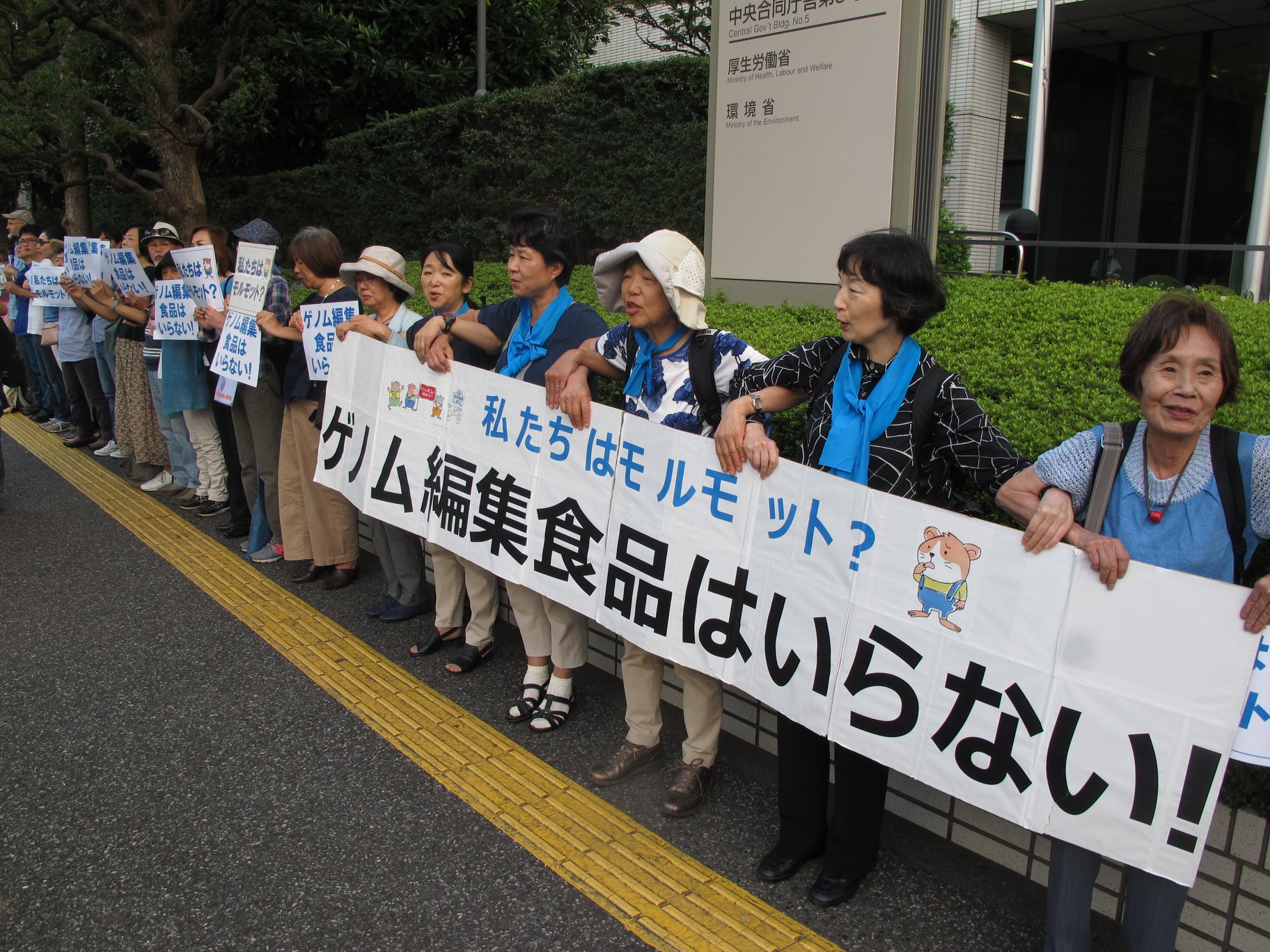 We held a protest action outside the Ministry of Health in Tokyo today on Wednesday, 25 September to protest against the lack of rules to deal with gene edited foods. Gene editing or genome editing may soon appear in food stores as the novel technology appears to gain ground among crops abroad. The lack of labelling in Japan is a serious problem.