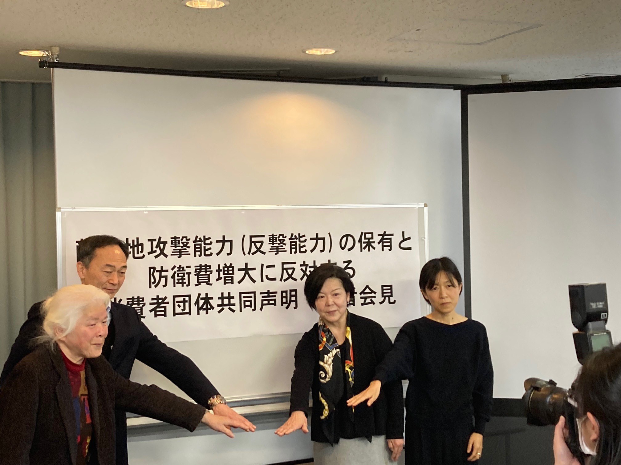 Joint statement: We, consumers, seek a peaceful society that respects life and livelihood. We oppose the possession of an enemy base attack capability (counterattack capability) and increased military expenditure.